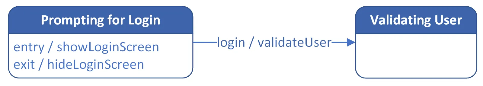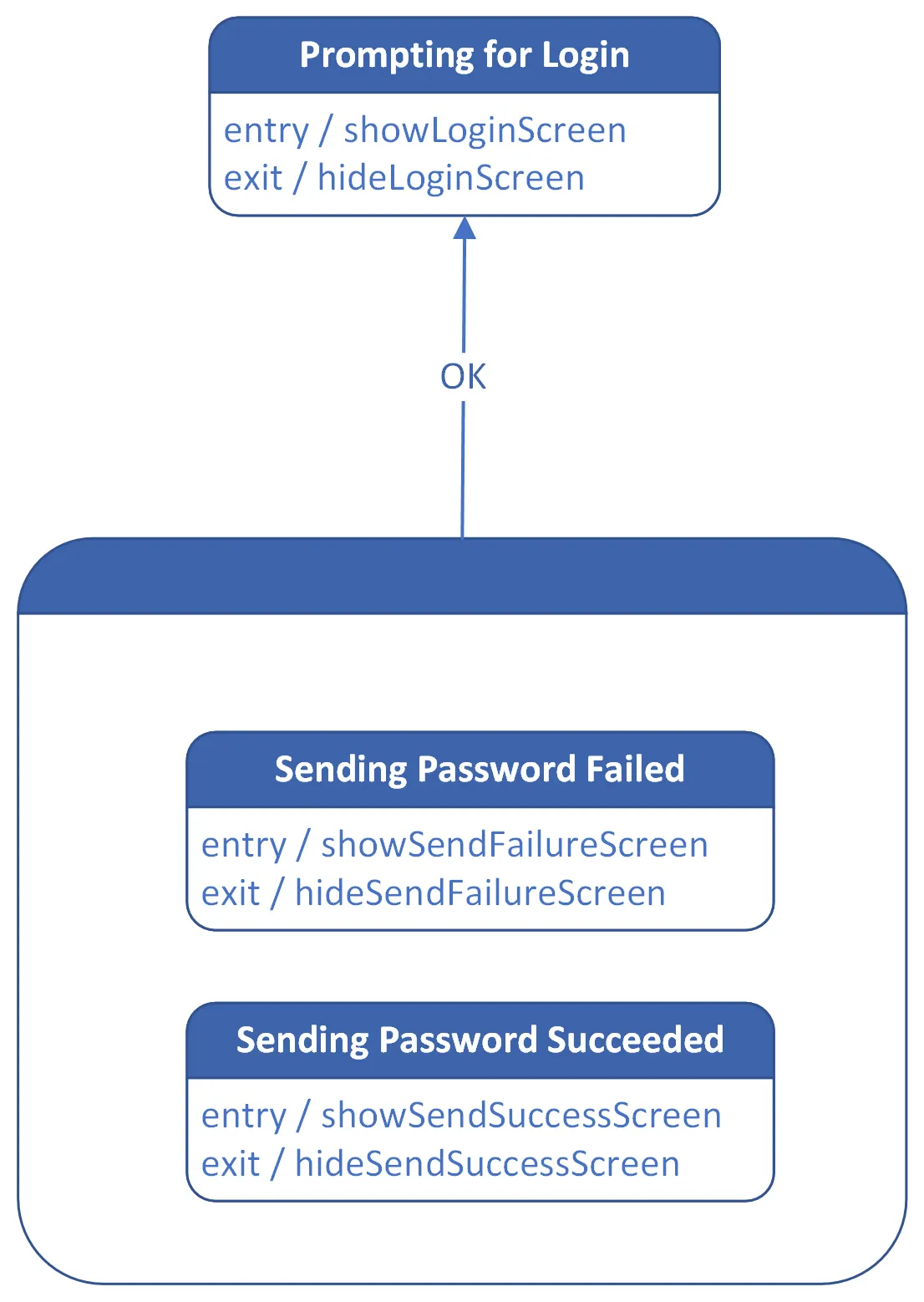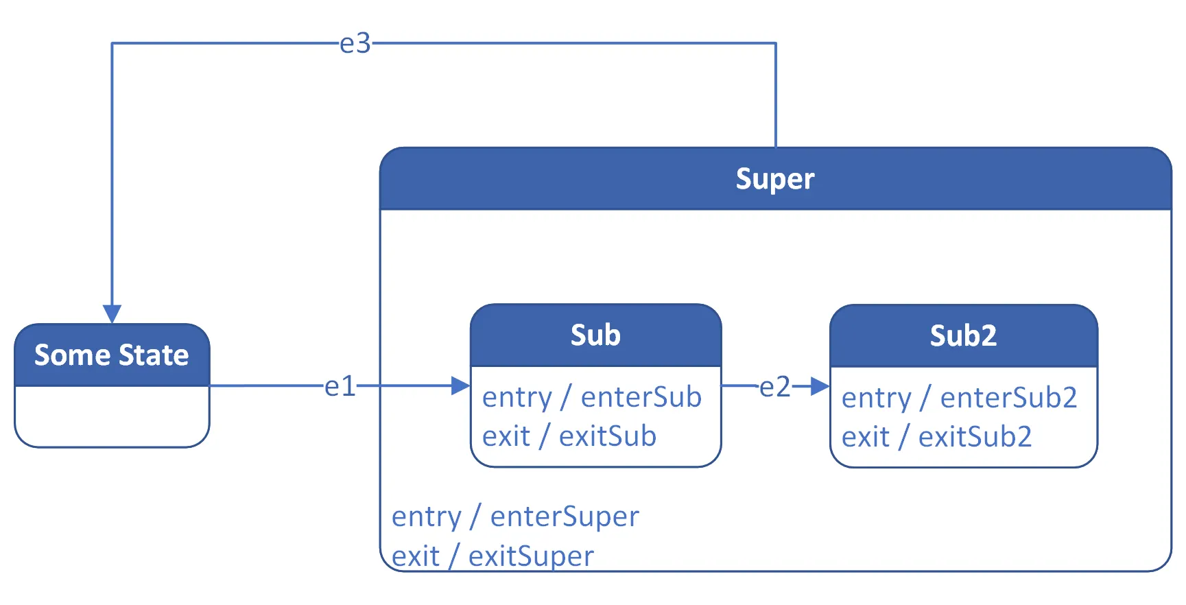 어떤 상태(Some State)에서 Sub 상태로 전이되어 들어오면 먼저 enterSuper 행동을 호출하고 그 다음 enterSub 행동을 호출함