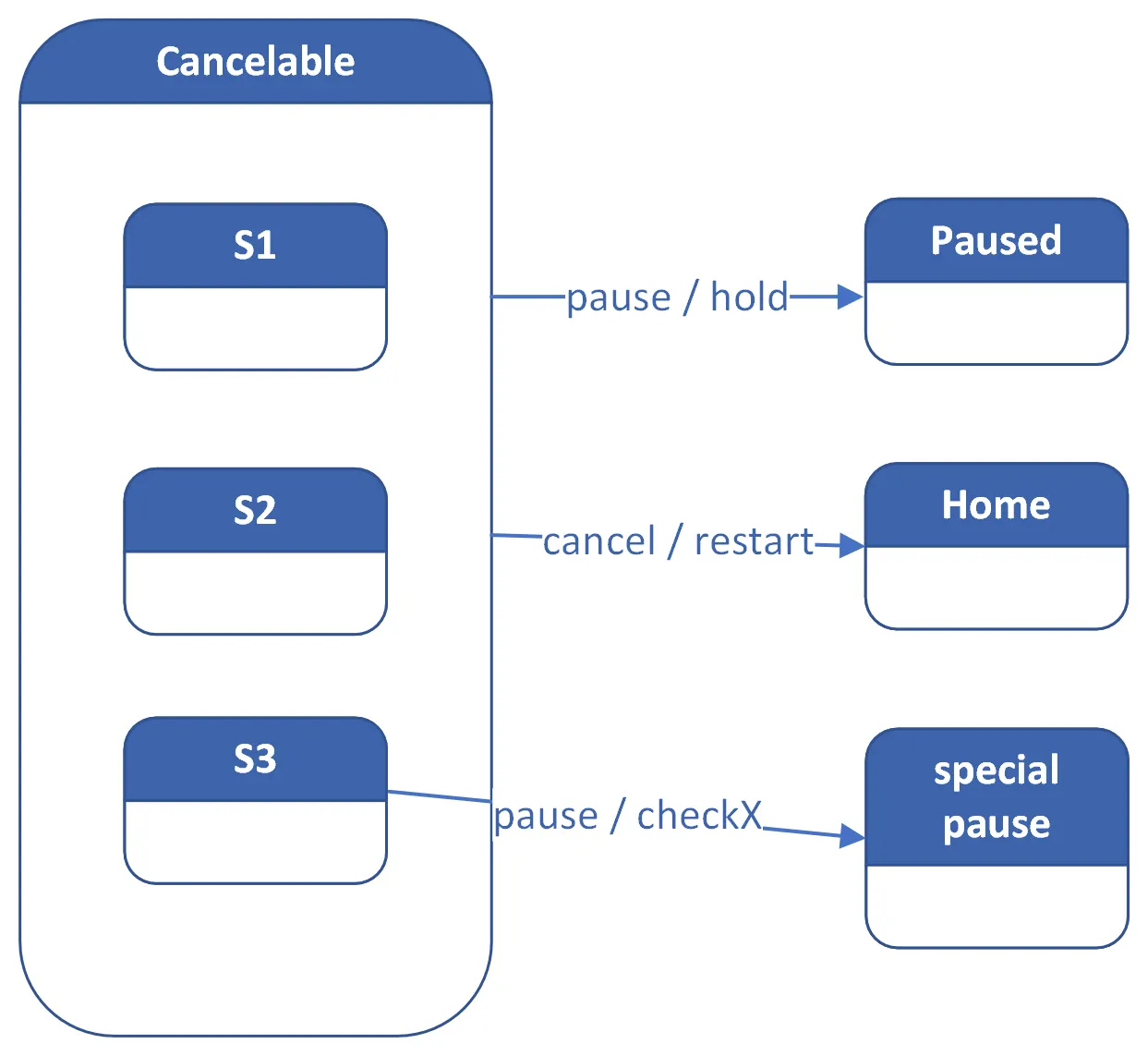 여러 상태가 동일한 이벤트에 반응하는 경우, 상위 상태를 사용하여 동일한 화살표의 중복을 피할 수 있음