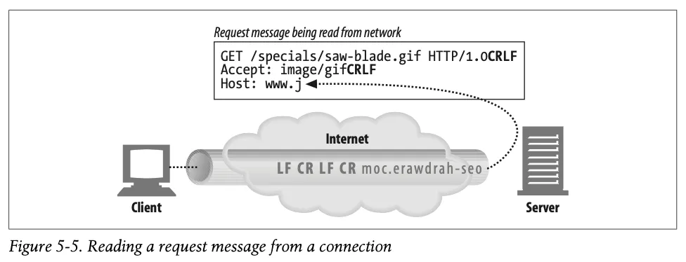 커넥션에 데이터가 도착하면, 웹 서버는 네트워크 커넥션에서 그 데이터를 읽어 들이고 파싱하여 요청 메시지를 구성한다.