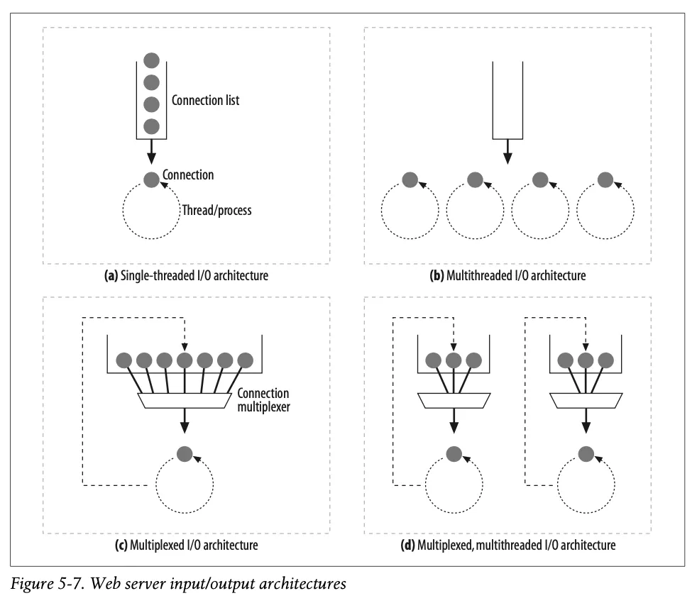 웹 서버들은 항상 새 요청을 주시하고 있다. 그림 5-7에 그려진 것과 같이, 웹 서버 아키텍처의 차이에 따라 요청을 처리하는 방식도 달라진다.