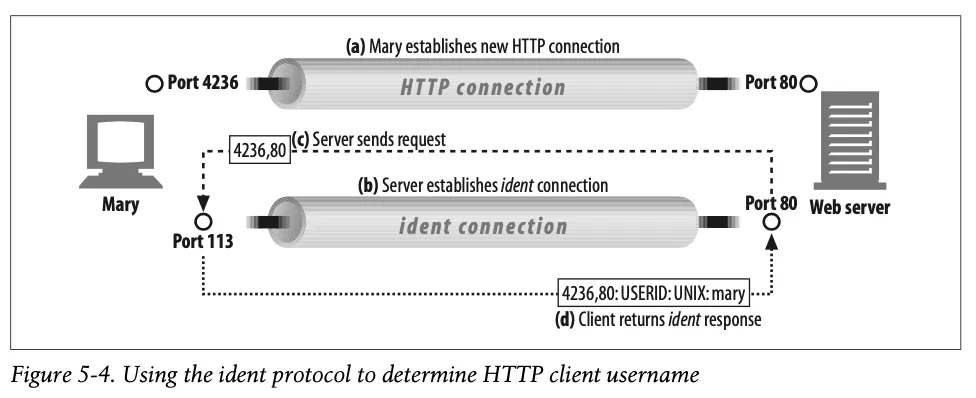 몇몇 웹 서버는 또한 IETF ident 프로토콜을 지원한다. ident 프로토콜은 서버에게 어떤 사용자 이름이 HTTP 커넥션을 초기화했는지 찾아낼 수 있게 해준다.(이 정보는 웹 서버 로깅에서 유용)