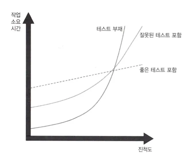 아래 그림을 보면 잘못 작성한 테스트도 초반에 코드가 나빠지는 것을 늦출 수 있다. 즉, 테스트가 전혀 없는 상황에 비해 개발 속도가 덜 느려진다.