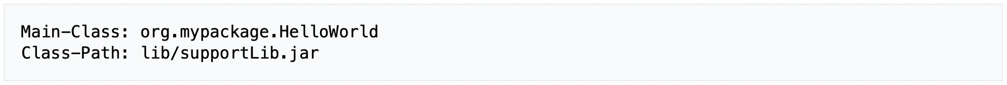 This automatically starts org.mypackage.HelloWorld specified in class Main-Class with the arguments. The user cannot replace this class name using the invocation java -jar. Class-Path describes the location of supportLib.jar relative to the location of the library helloWorld.jar. Neither absolute file path, which is permitted in -classpath parameter on the command line, non jar-internal path are supported. This means that if the main class file is contained in a jar, org/mypackage/HelloWorld.class must be a valid path on the root within the jar.