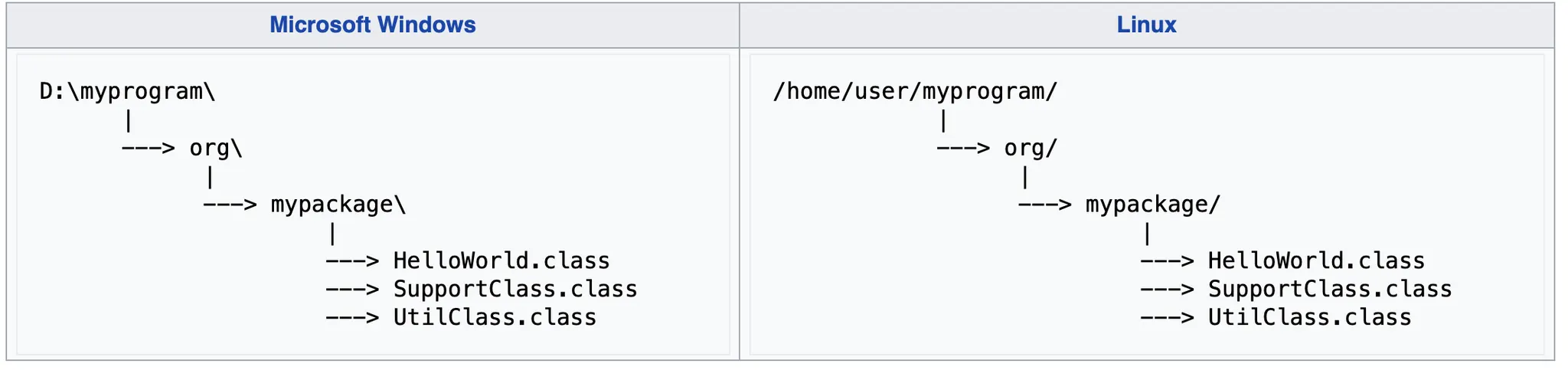 and the files defining this package are stored physically under the directory D:\myprogram (on Windows) or /home/user/myprogram (on Linux).