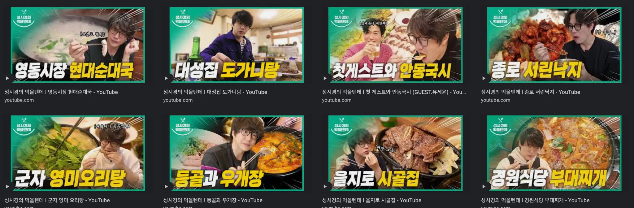 최근 유튜브 채널에서 화제가 되고있는 ‘성시경의 먹을텐데~’ 에서 나오는 식당들을 보여주고, 카카오 T와의 연동을 통해 바로 길찾기 서비스 등의 기능도 구현가능하다. 식당을 보여줄 땐 해당 동영상의 썸네일을 메인에 보여주고 해당 글에 들어가면 위치, 메뉴, 가격 등 제주로드 때와 비슷한 정보를 알려준다.