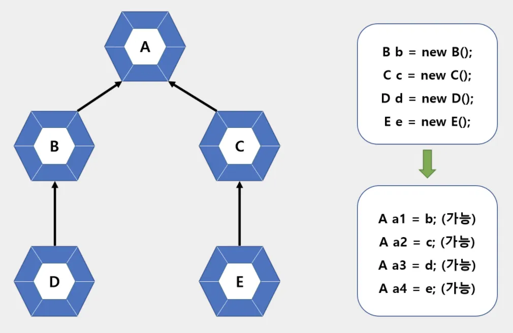 상속에서 부모 타입에 어떤 자식 객체를 대입하느냐에 따라서 다양한 결과를 얻을 수 있다.