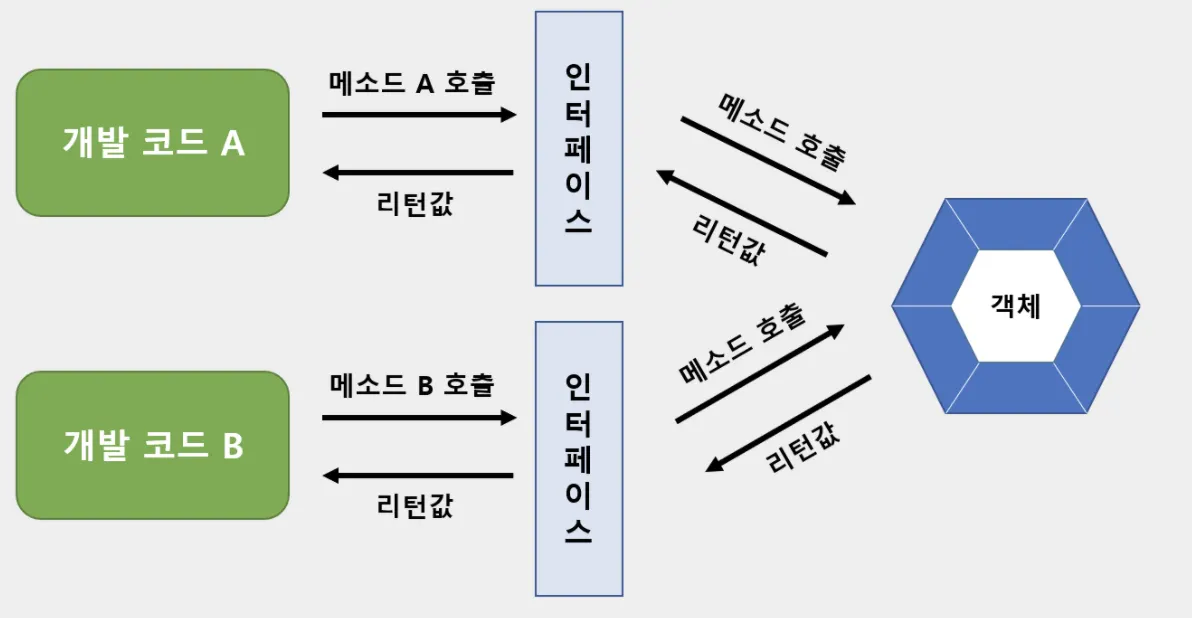 개발 코드에서 인터페이스의 메소드를 호출하면 인터페이스는 객체의 메소드를 호출한다.