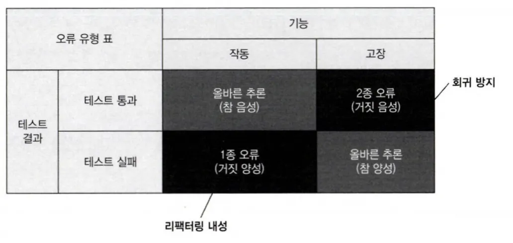 테스트 결과를 넓은 관점으로 바라본 그림이다. 코드 정확도와 테스트 결과에 대해서는 네 가지 결과가 있을 수 있다.