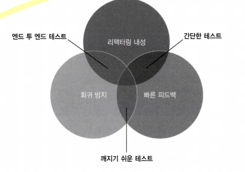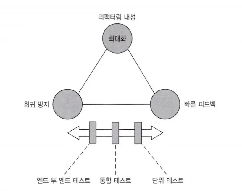 좋은 단위 테스트의 처음 세 가지 특성 (회귀 방지, 리팩터링 내성, 빠른 피드백)은 상호 배타적이다. 안타깝게도 세 가지 특성 모두 완벽한 점수를 얻어서 이상적인 테스트를 만드는 것은 불가능하다.