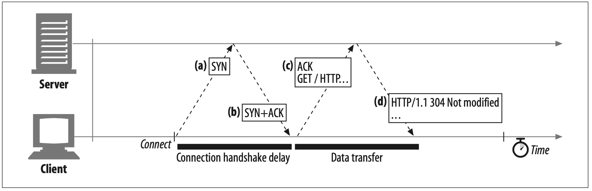 The SYN/SYN+ACK handshake (Figure 4-8a and b) creates a measurable delay when HTTP transactions do not exchange much data, as is commonly the case. The TCP connect ACK packet (Figure 4-8c) often is large enough to carry the entire HTTP request message,* and many HTTP server response messages fit into a single IP packet (e.g., when the response is a small HTML file of a decorative graphic, or a 304 Not Modified response to a browser cache request).