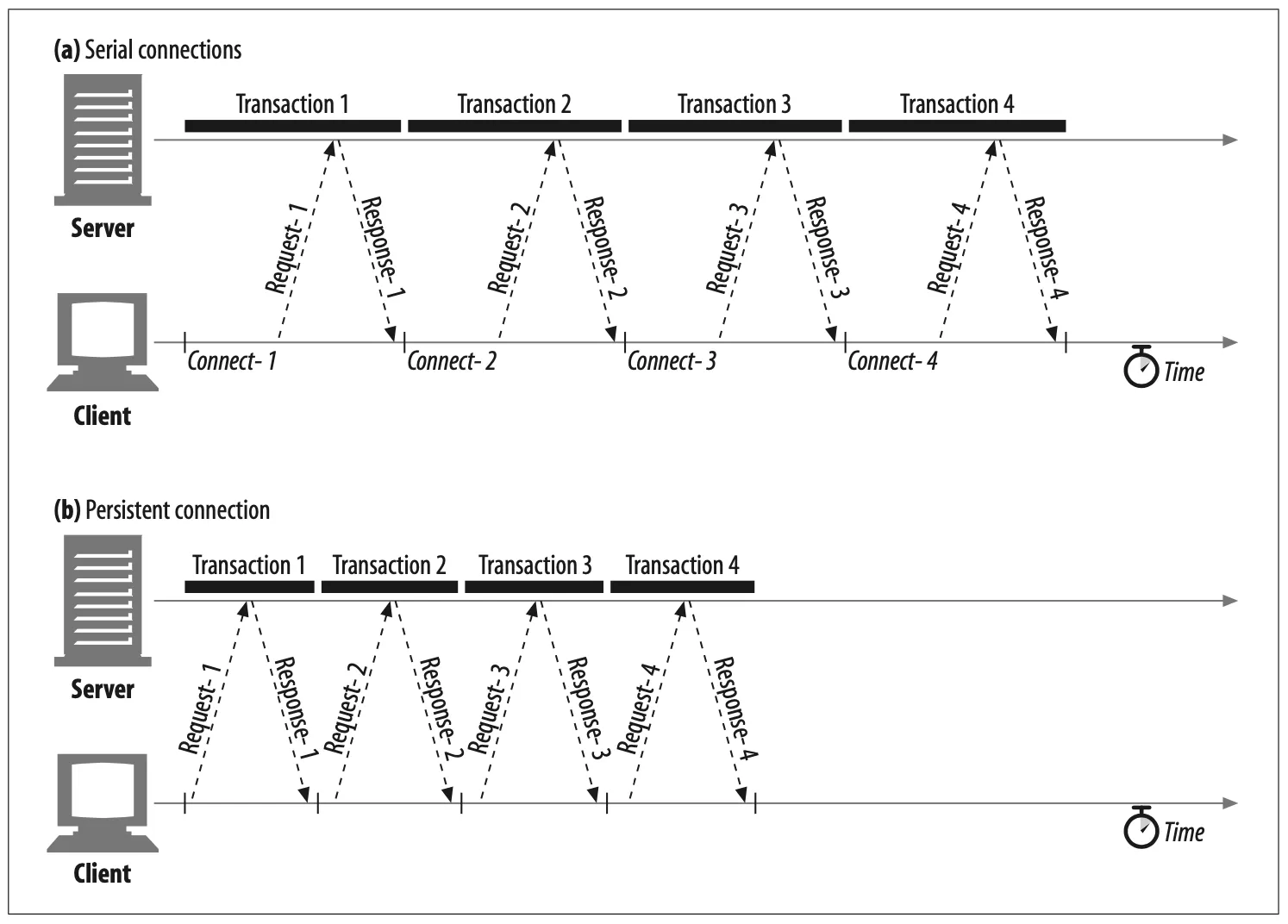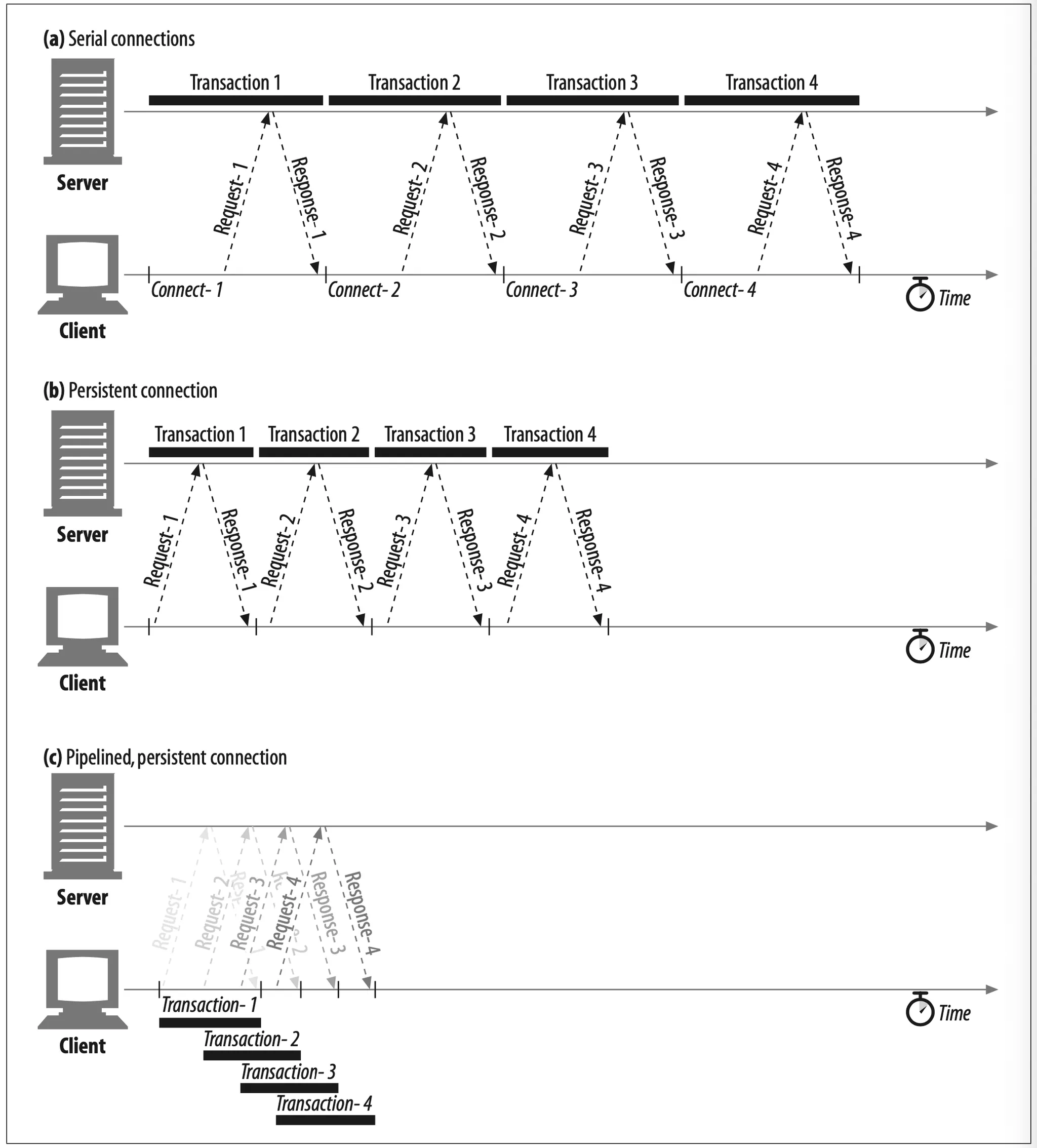 Figure 4-18a-c shows how persistent connections can eliminate TCP connection delays and how pipelined requests (Figure 4-18c) can eliminate transfer latencies.