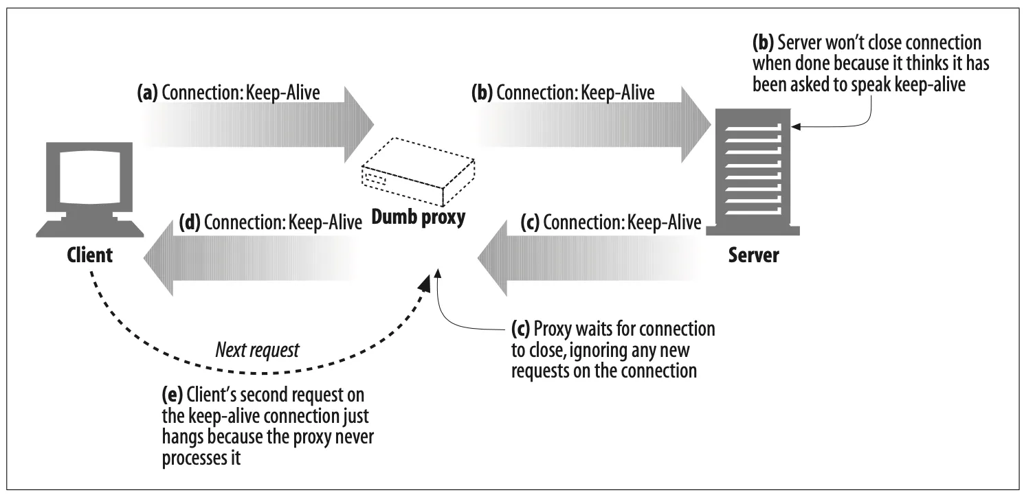 The problem comes with proxies—in particular, proxies that don’t understand the Connection header and don’t know that they need to remove the header before proxying it down the chain. Many older or simple proxies act as blind relays, tunneling bytes from one connection to another, without specially processing the Connection header.