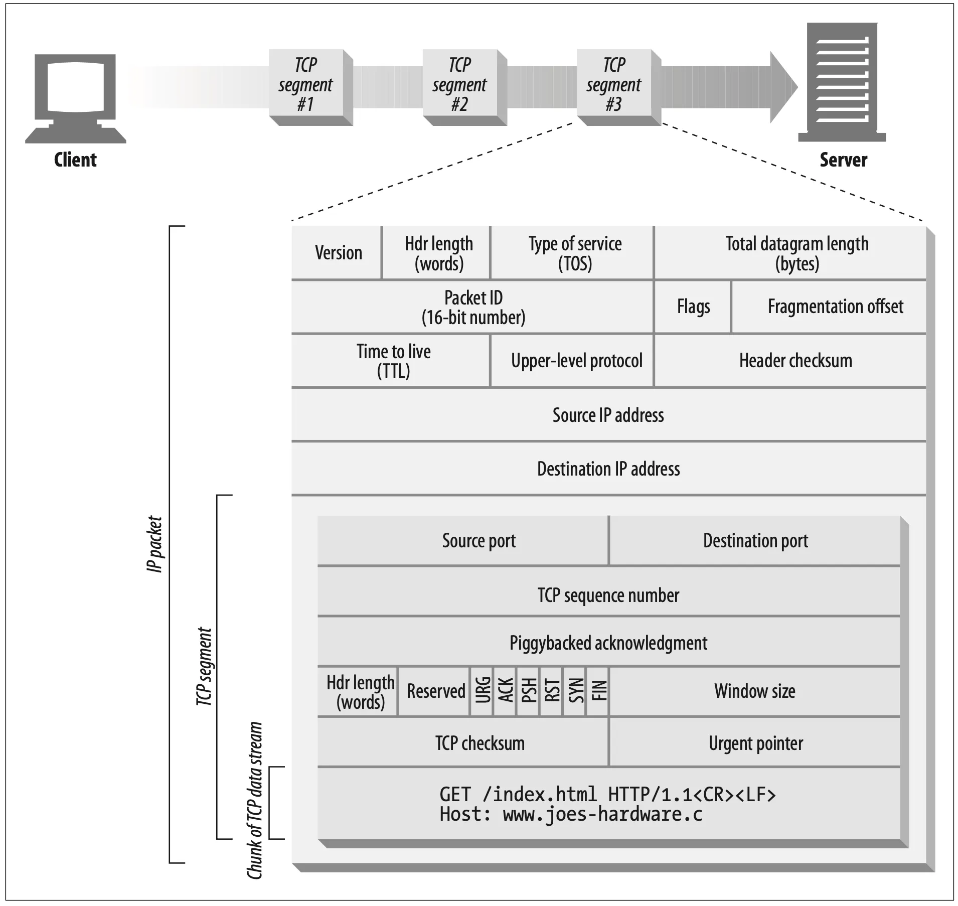 Figure 4-4. IP packets carry TCP segments, which carry chunks of the TCP data stream.