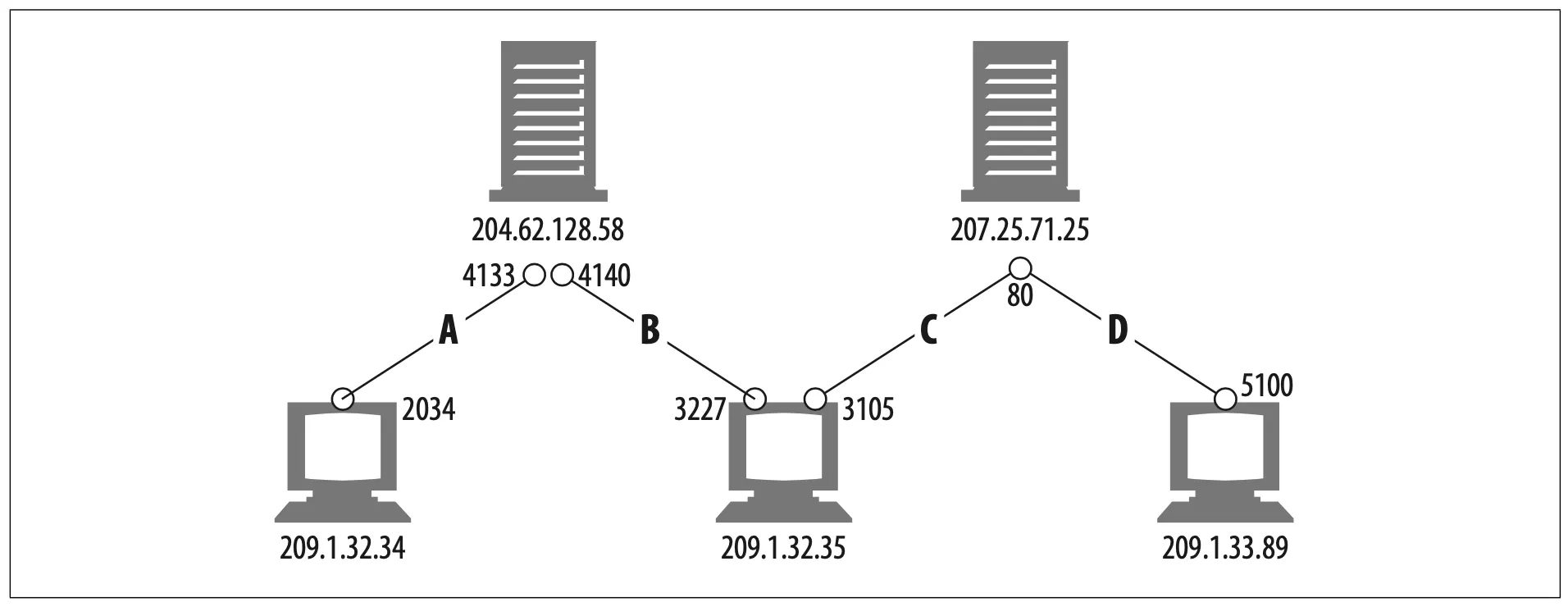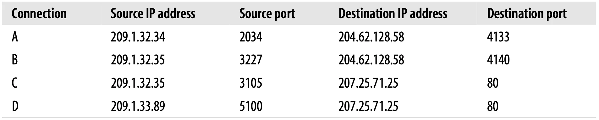 Note that some of the connections share the same destination port number (C and D both have destination port 80). Some of the connections have the same source IP address (B and C). Some have the same destination IP address (A and B, and C and D). But no two different connections share all four identical values.
