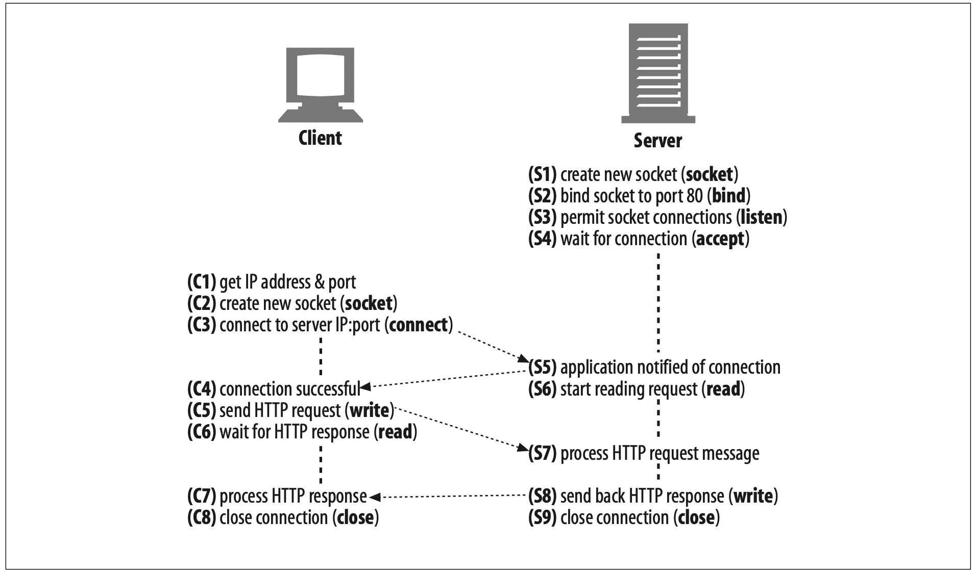 Once the connection is set up, the client sends the HTTP request (Figure 4-6, C5) and the server reads it (Figure 4-6, S6). Once the server gets the entire request mes- sage, it processes the request, performs the requested action (Figure 4-6, S7), and writes the data back to the client. The client reads it (Figure 4-6, C6) and processes the response data (Figure 4-6, C7).