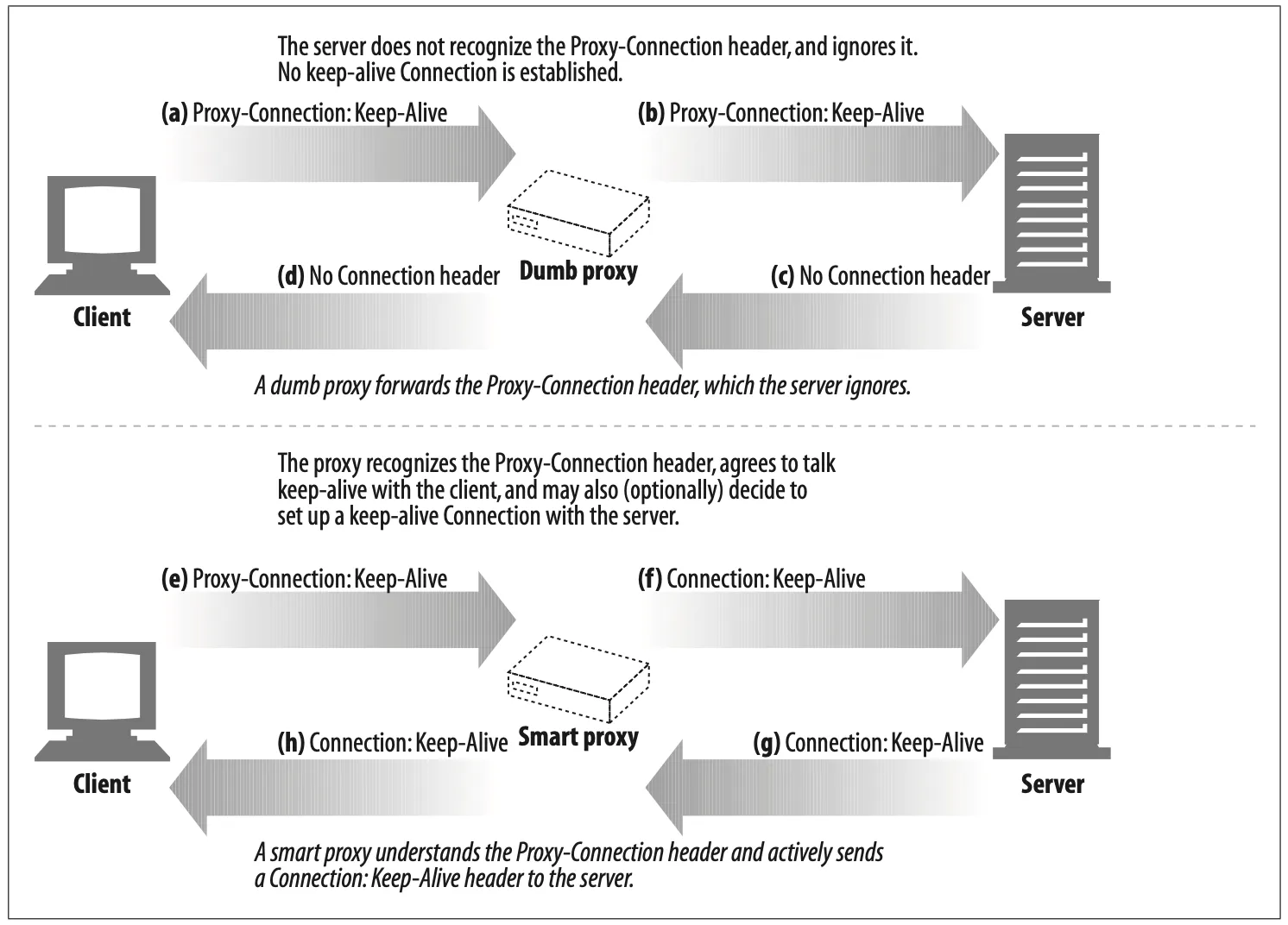 Figure 4-16a–d shows how a blind relay harmlessly forwards Proxy-Connection head- ers to the web server, which ignores the header, causing no keep-alive connection to be established between the client and proxy or the proxy and server. The smart proxy in Figure 4-16e–h understands the Proxy-Connection header as a request to speak keep-alive, and it sends out its own Connection: Keep-Alive headers to establish keep-alive connections.
