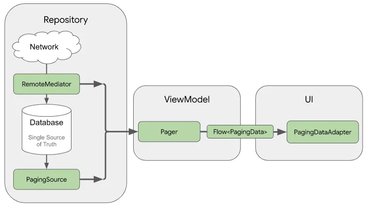 Pager와 PagingSource를 사용하여 PagingData로 반환한다. PagingConfig로 페이지의 기본 설정을 정의한 후 Pager 객체를 생성한다.