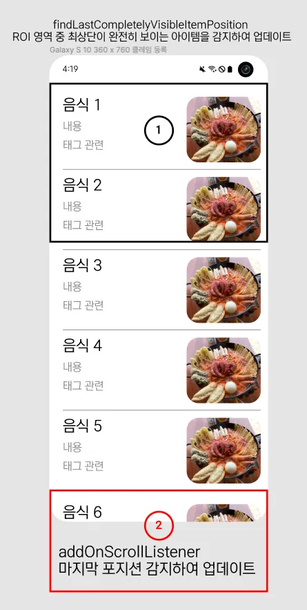 사용할 RecyclerView의 addOnScrollListener 를 추가하여 현재 화면에 출력된 리스트 중 마지막 View의 position을 감지하거나 findLastCompletelyVisibleItemPosition 를 사용하여 모든 아이템 중 최상단이 완전히 보이는 가장 상위의 아이템의 포지션을 감지하여 업데이트 한다.