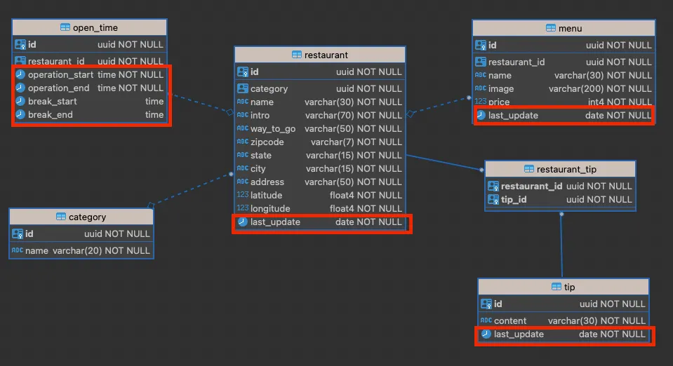 1안) restaurant, menu, tip 모두 각각 last_update 정보가 있게 구현