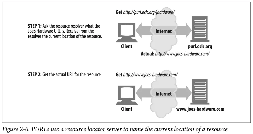 하지만 URL이 완벽한 것은 아니다. URL은 주소이지 실제 이름이 아니라 특정 시점에 어떤 것이 위치한 곳을 알려주는 것이다. URL은 리소스를 찾는데 필요한 포트와 서버 이름을 제공하는데 이런 스킴의 단점은 리소스가 옮겨지면 URL을 더는 사용할 수 없다는 것이다. 그리고 그 시점에 기존 URL이 가리키고 있던 객체를 찾을 방법이 없어진다.