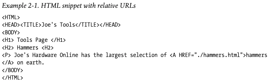 위 예는 http://www.joes-hardware.com/tools.html 가 가리키는 리소스인 HTML 문서의 내용이다. 해당 문서에서는 하이퍼링크로 './hammers.html'을 사용한다.