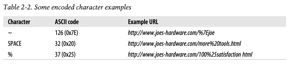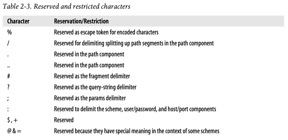 아래의 표2-3은 URL에서 예약된 문자들을 본래의 목적이 아닌 다른 용도로 사용하려면, 그 전에 반드시 인코딩해야 하는 문자들을 나열해 놓았다.