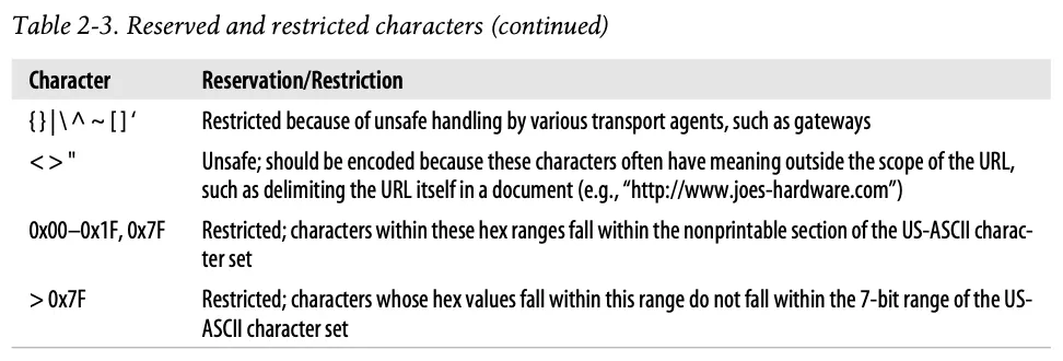 몇몇 문자는 URL 내에서 특별한 의미로 예약되어 있다. 어떤 문자는 US-ASCII의 출력 가능한 문자 집합에 포함되어 있지 않다.