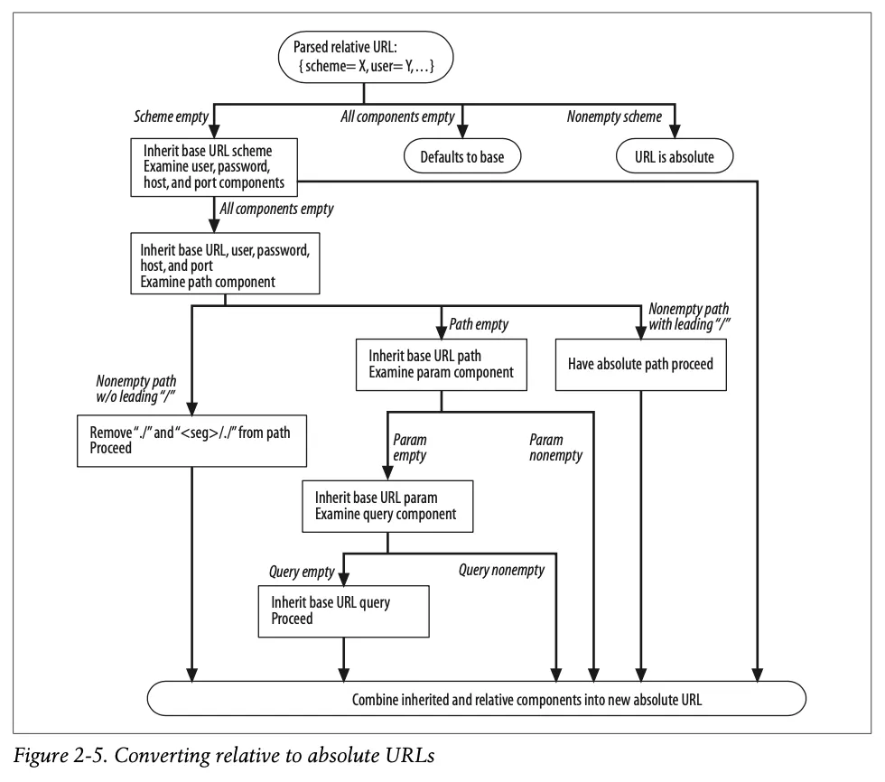 이 작업을 URL 분해하기라고 부르기도 한다. 기저 URL과 상대 URL을 컴포넌트로 분리하고 나면, 변환을 끝내기 위해 그림 2-5에서 설명하고 있는 알고리즘을 사용할 수 있다.
