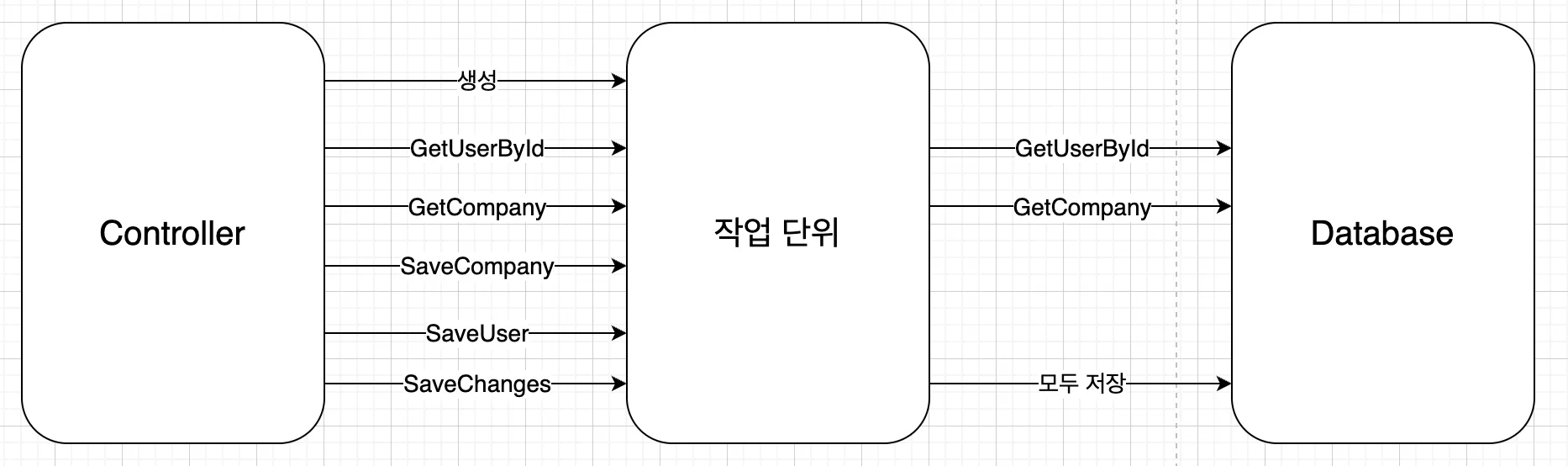 대부분의 ORM 라이브러리가 작업 단위 패턴을 구현한다. UserController에 엔티티 프레임워크를 적용하면 다음 예제와 같아진다.