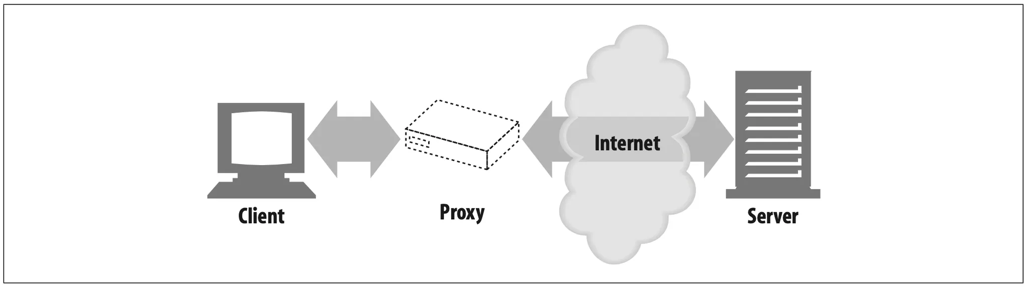 As shown in Figure 1-11, a proxy sits between a client and a server, receiving all of the client's HTTP requests and relaying the requests to the server(perhaps after modifying the request). These applications act as a proxy for the user, accessing the server on the user's behalf.