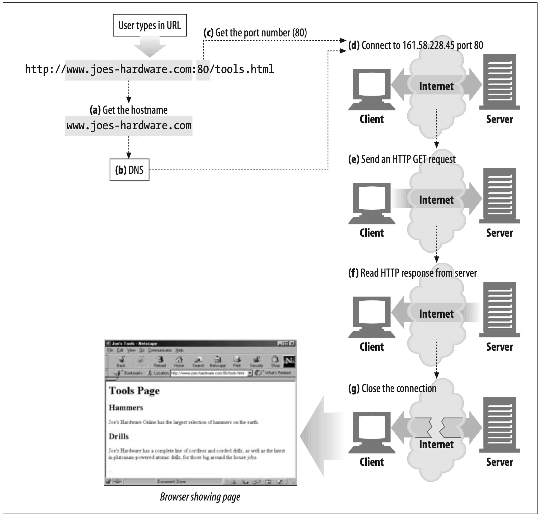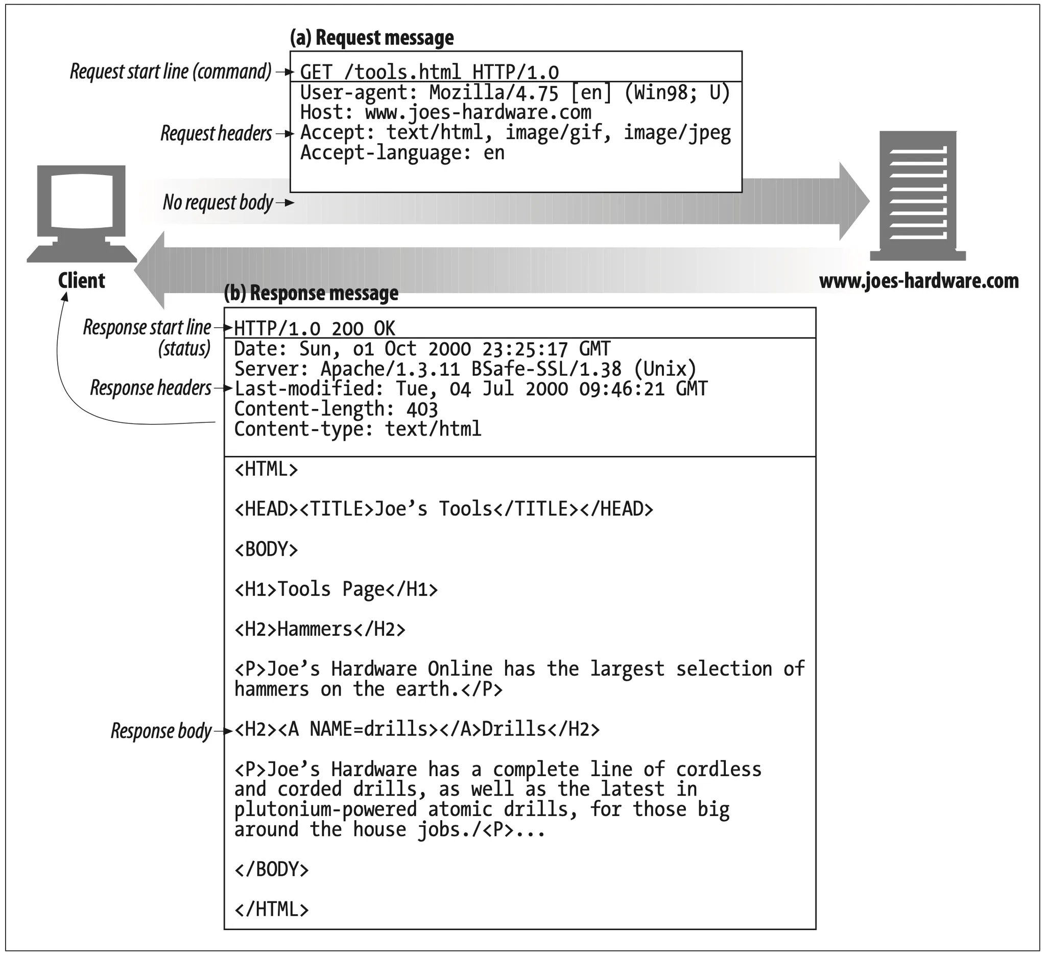 Figure 1-8 shows the HTTP messages that might be sent as part of a simple transaction. The browser requests the resource http://www.joes-hardware.com/tools.html.