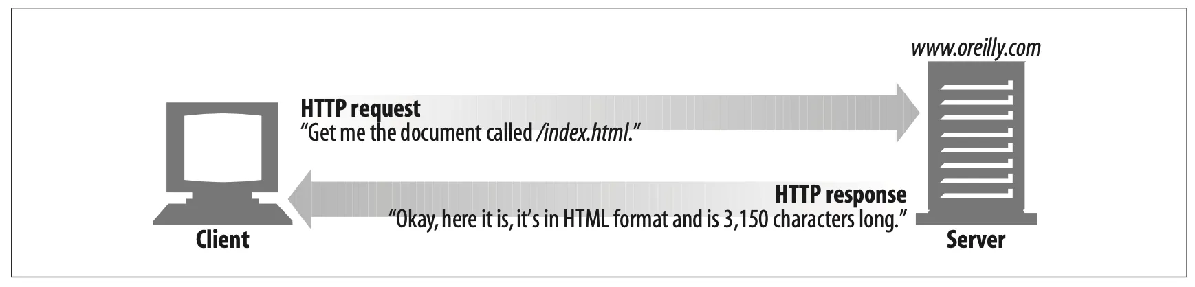 Web content lives on web servers. Web servers speak the HTTP protocol, so they are often called HTTP servers. These HTTP servers store the Internet's data and provide the data when it is requested by HTTP clients. The clients send HTTP request to servers, and servers return the requested data in HTTP responses, as sketched in Figure 1-1. HTTP clients and HTTP servers make up the basic components of the World Wide Web.