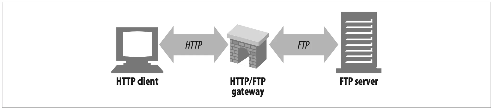 For example, an HTTP/FTP gateway receives requests for FTP URIs via HTTP requests but fetchs the documents using the FTP protocol (see Figure 1-13). The resulting document is packed into an HTTP message and sent to the client. We discuss gateways in Chapter 8.