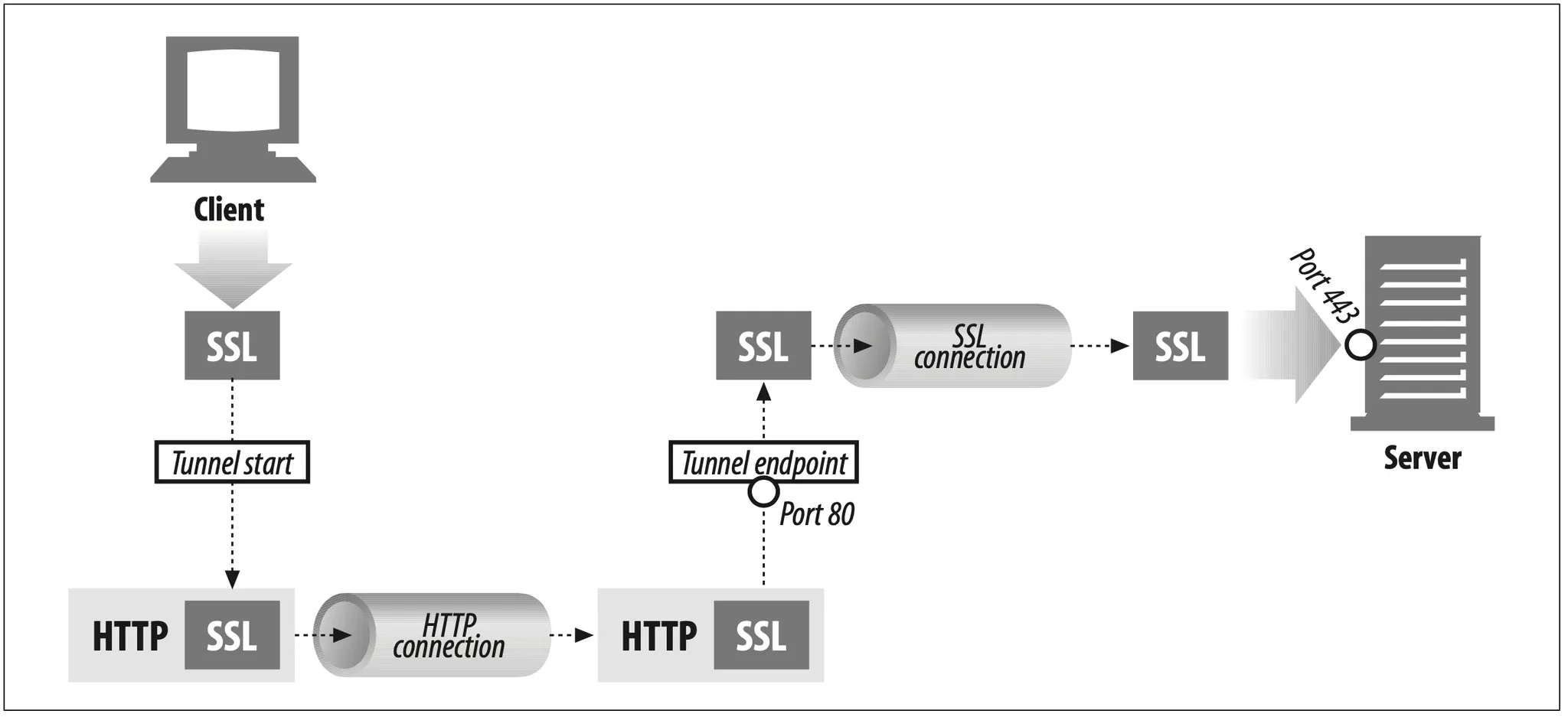 One popular use of HTTP tunnels is to carry encrypted Secure Sockets Layer (SSL) traffic through an HTTP connection, allowing SSL traffic through corporate firewalls that permit only web traffic. As sketched in Figure 1-14, an HTTP/SSL tunnel receives an HTTP request to establish an outgoing connection to a destination address and port, then proceeds to tunnel the encrypted SSL traffic over HTTP channel so that it can be blindly relayed to the destination server.