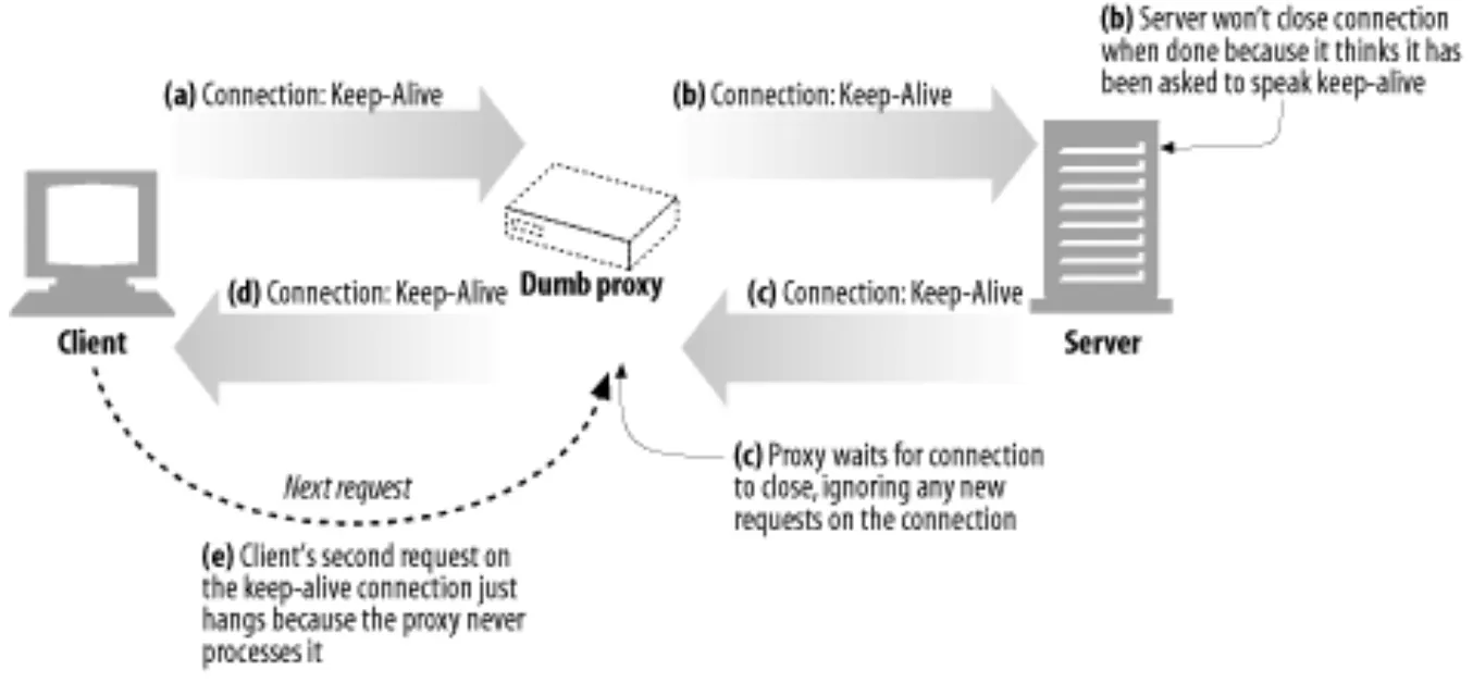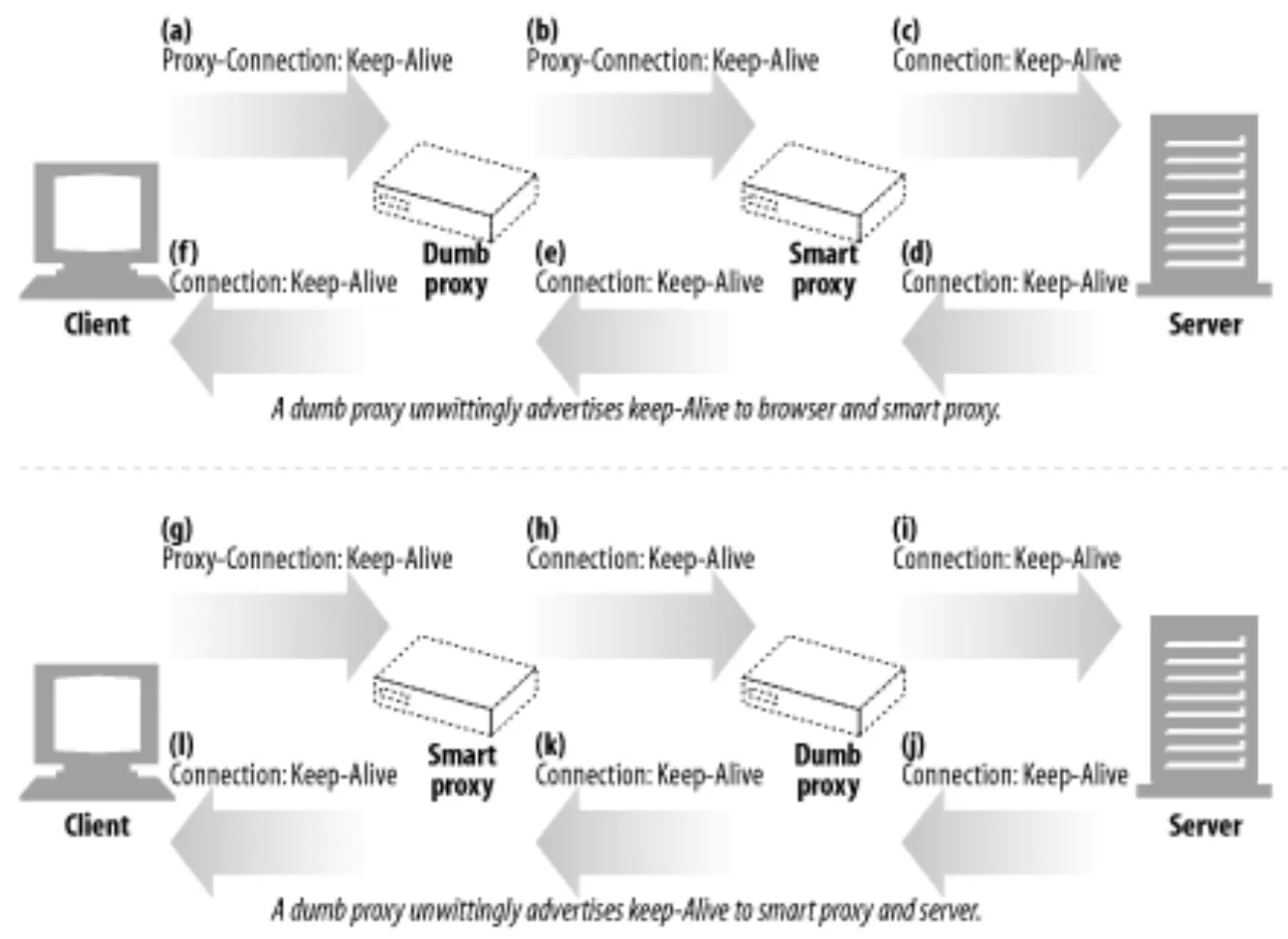 멍청한 프락시는 'Connection:Keep-Alive' 헤더를 이해하지 못해 서버에 그대로 전달한다. Connection 헤더는 홉별 헤더이므로 인접한 애플리케이션간에 적용하고 삭제한 뒤에 전달해야 한다.