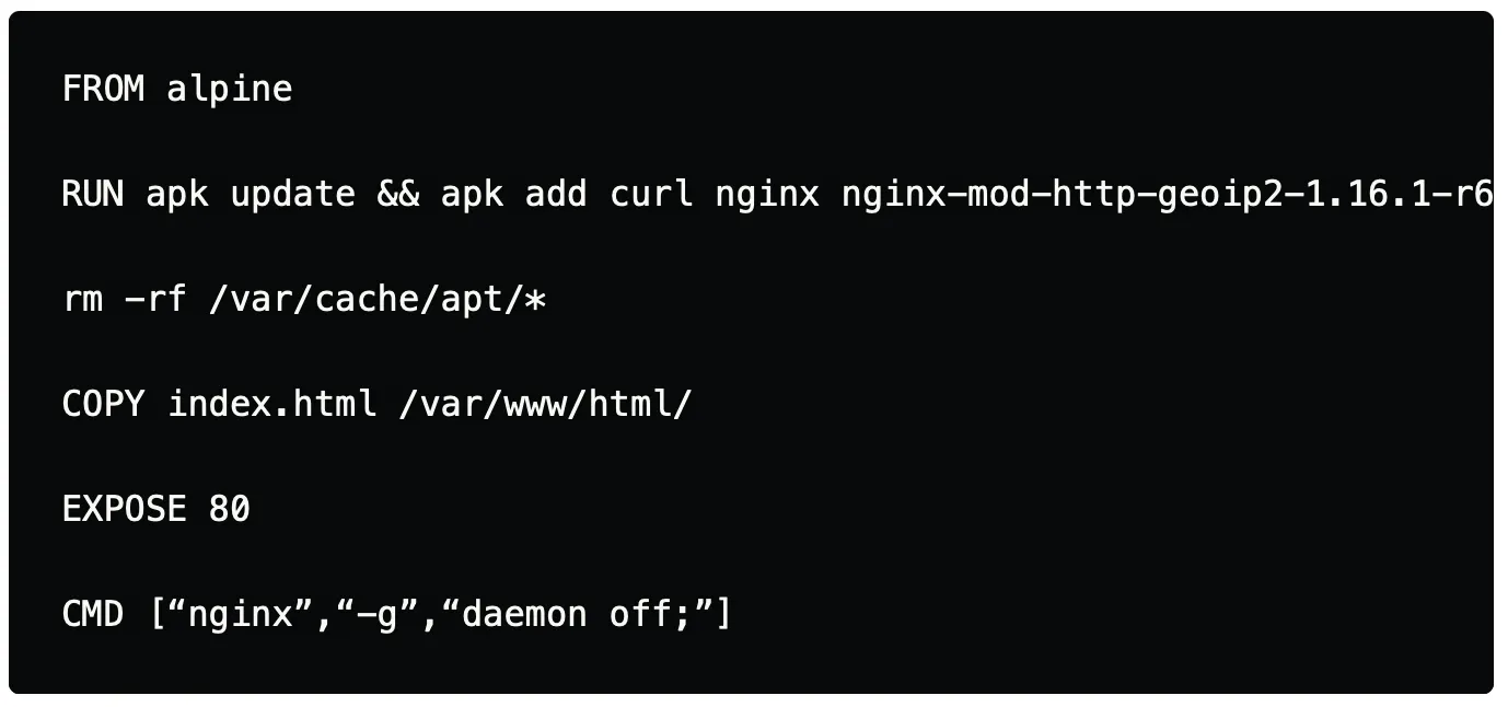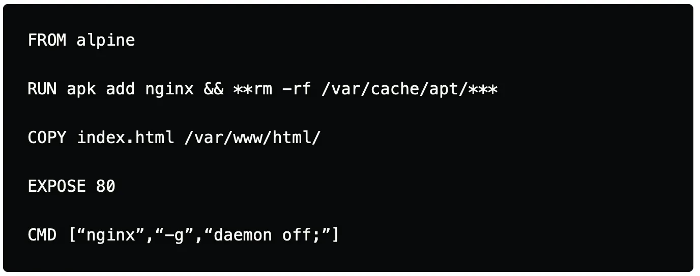 In the example below, we will be installing Nginx webserver to server static HTML webpages. As we install the Nginx package alongside we will also remove the cache packages that have been stored in the specific path of the cache directory. In this case, as we are using alpine we have specified the directory which contains the cache for the packages.