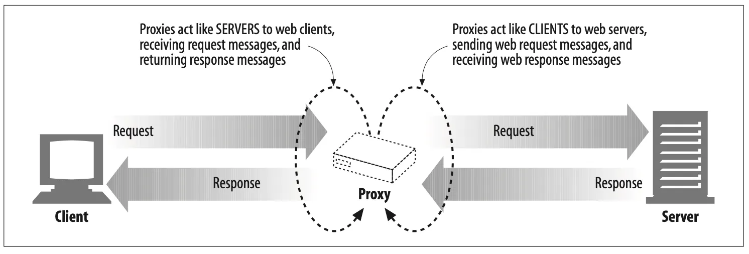 웹 프록시 서버는 중개자(intermediaries)이며, 클라이언트와 서버 사이에 위치하여 그들 사이의 메시지를 정리하는 중개인처럼 동작한다.