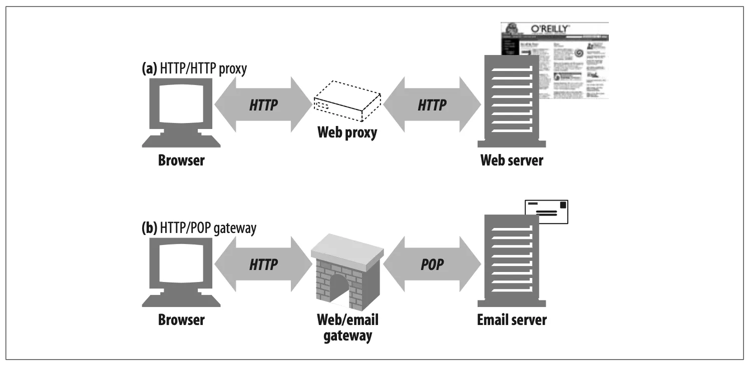 Figure 6-2. Proxies speak the same protocol; gateways tie together different protocols