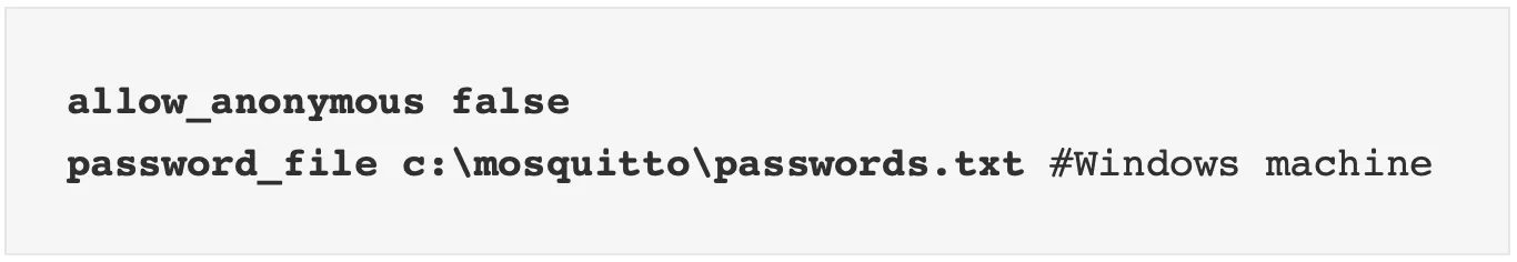 The username used for authentication can also used in restricting access to topics. On the Mosquitto broker you need to configure two settings for this to work. Again you will find these settgins in the security section of the mosquitto.conf file. They are allow_anonymous and password_file. To require username/password then allow_anonymous should be false and password_file should contain a valid passwords file.